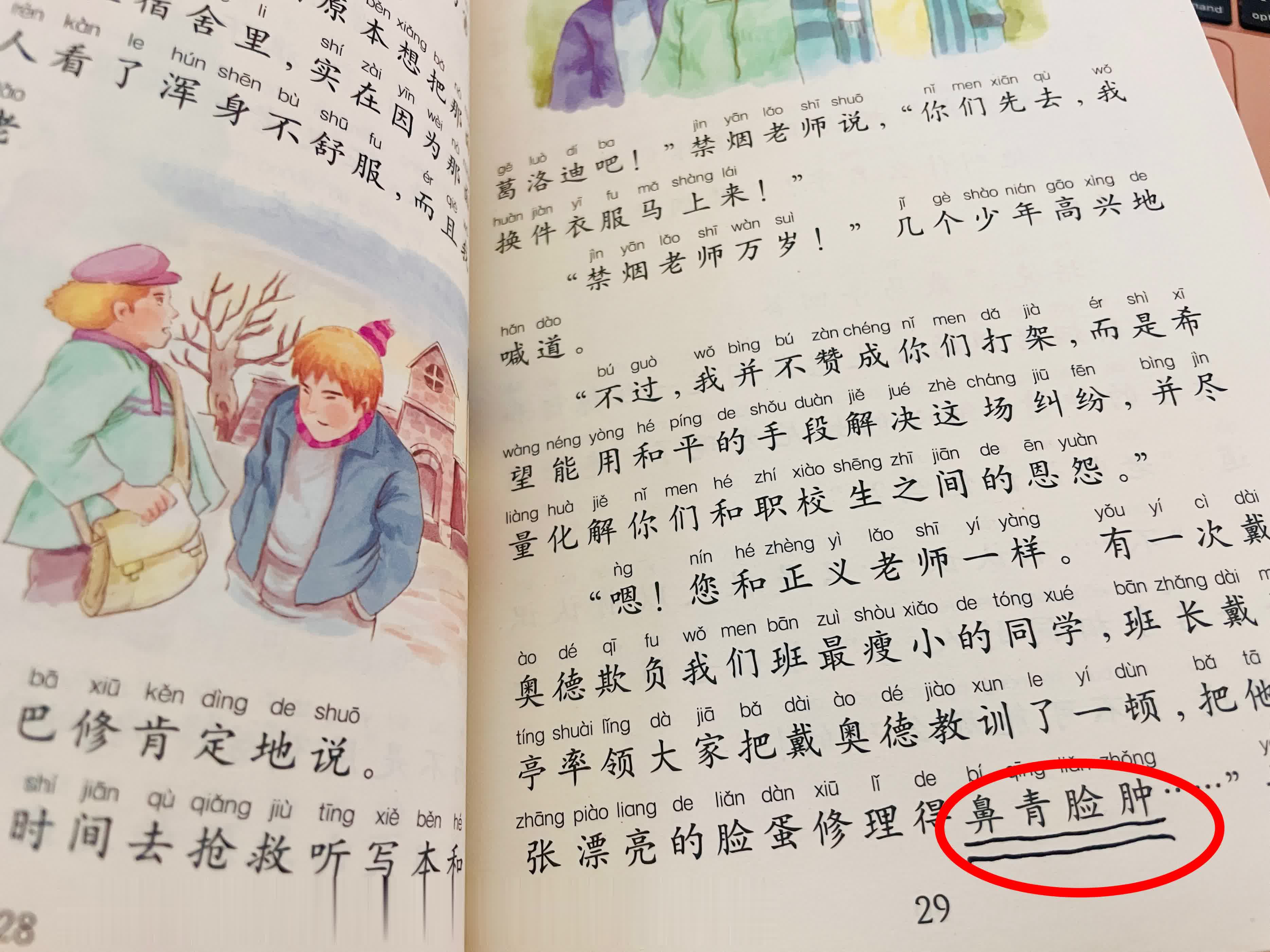 比如读到第29页“把他那张漂亮的脸蛋修理得鼻青脸肿”,孩子突然想到《哪吒之魔童闹海》里无量仙翁被打后的样子,还指着自己的脸手舞足蹈地比划着描述:“这里发青,这里又鼓起来个大包!”
