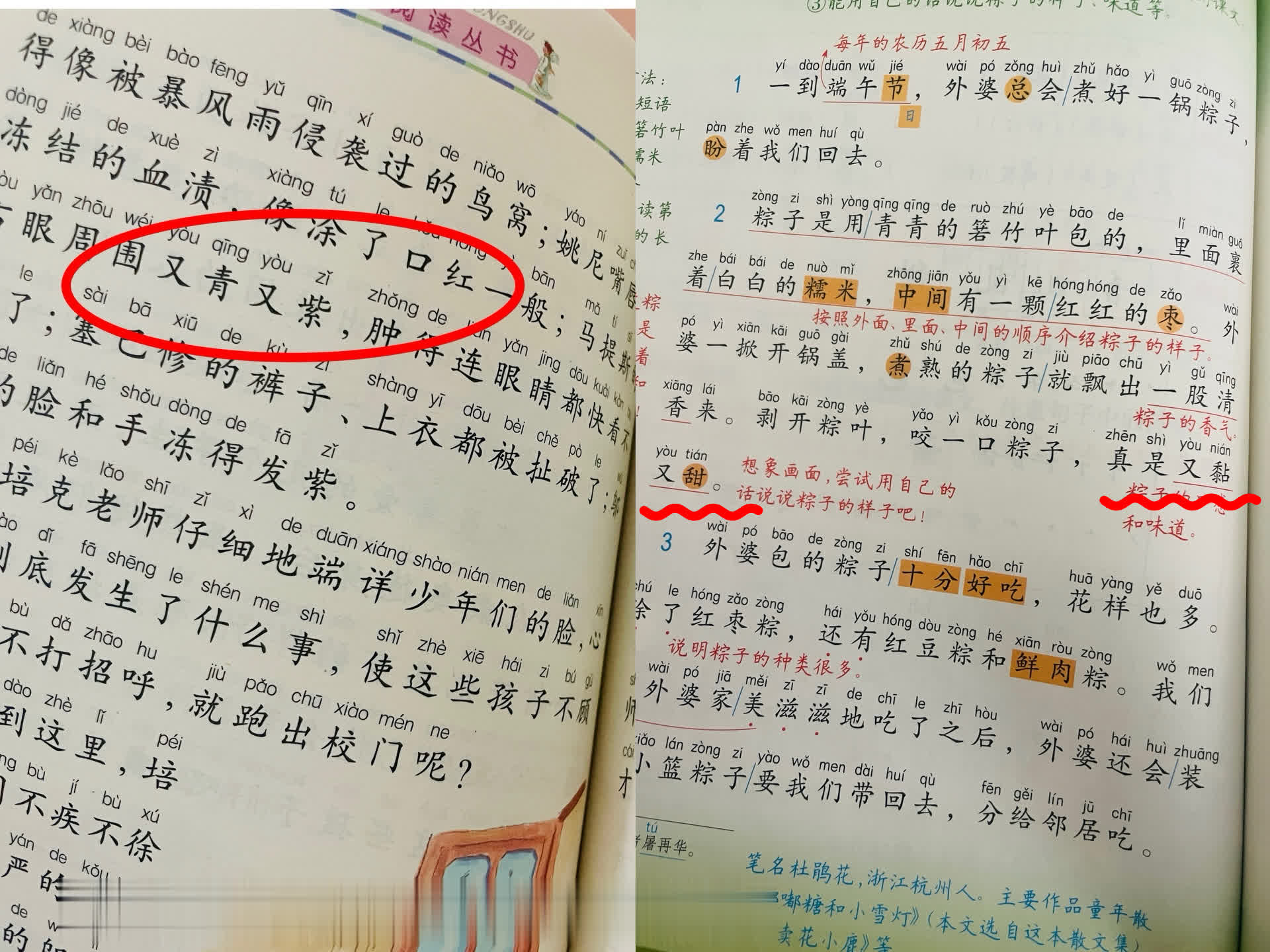 比如在第68页看到“马提斯的右眼周围又青又紫”,孩子想到很多类似ABAC式词语,又高又大、又矮又小、又香又甜、又红又圆、又白又嫩、又黏又甜等等。提到又黏又甜,还想到是课文《端午粽》中形容粽子的词语。
