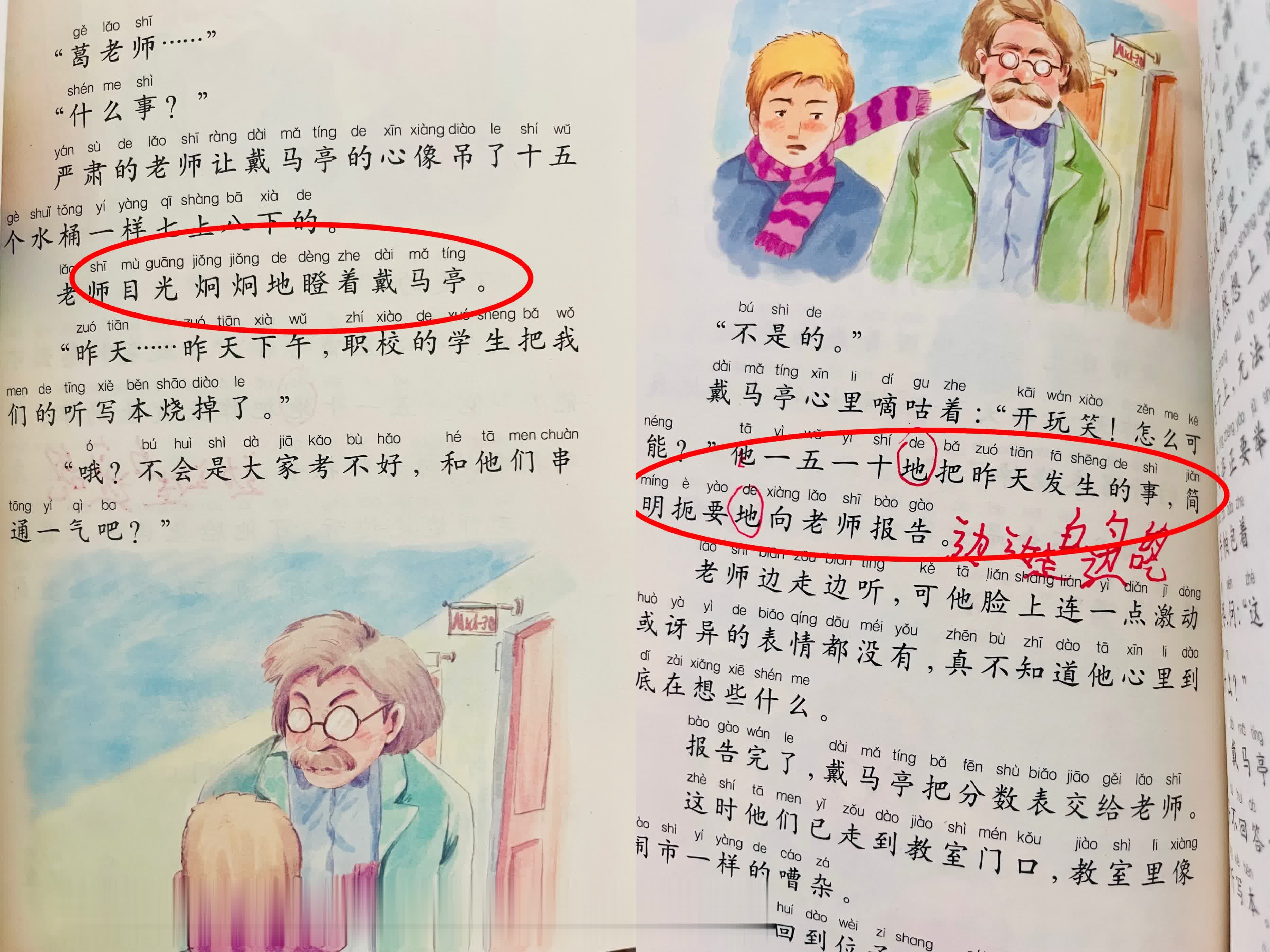 第101页的“老师目光炯炯地等着戴马亭”,102页的“他一五一十地把昨天发生的事,简明扼要地向老师报告”,这里之所以用“地”,是因为后面是做什么事。读到第89页“看,这一家人笑得多幸福呀!”发现原来“的、地”之外还有一个“得”,开启新的探索之旅。