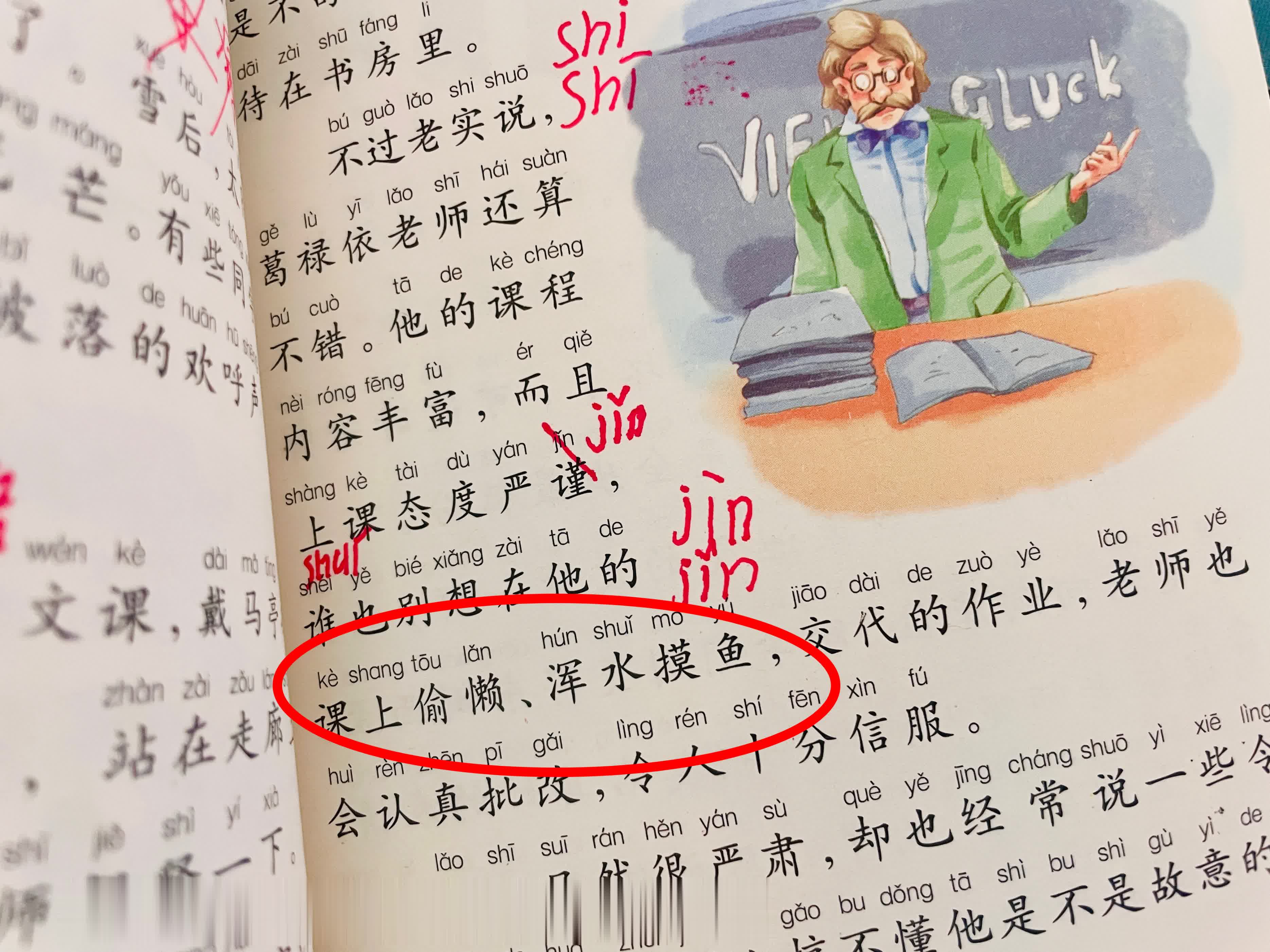 还比如第99页提到“课上偷懒、浑水摸鱼”,孩子马上想起老师批评同学的话,趁机问他:“老师是怎么提醒的?”他站起来严肃地说:“某些同学不认真学习,光想着浑水摸鱼”。然后一本正经地告诉我:“我没有浑水摸鱼!”