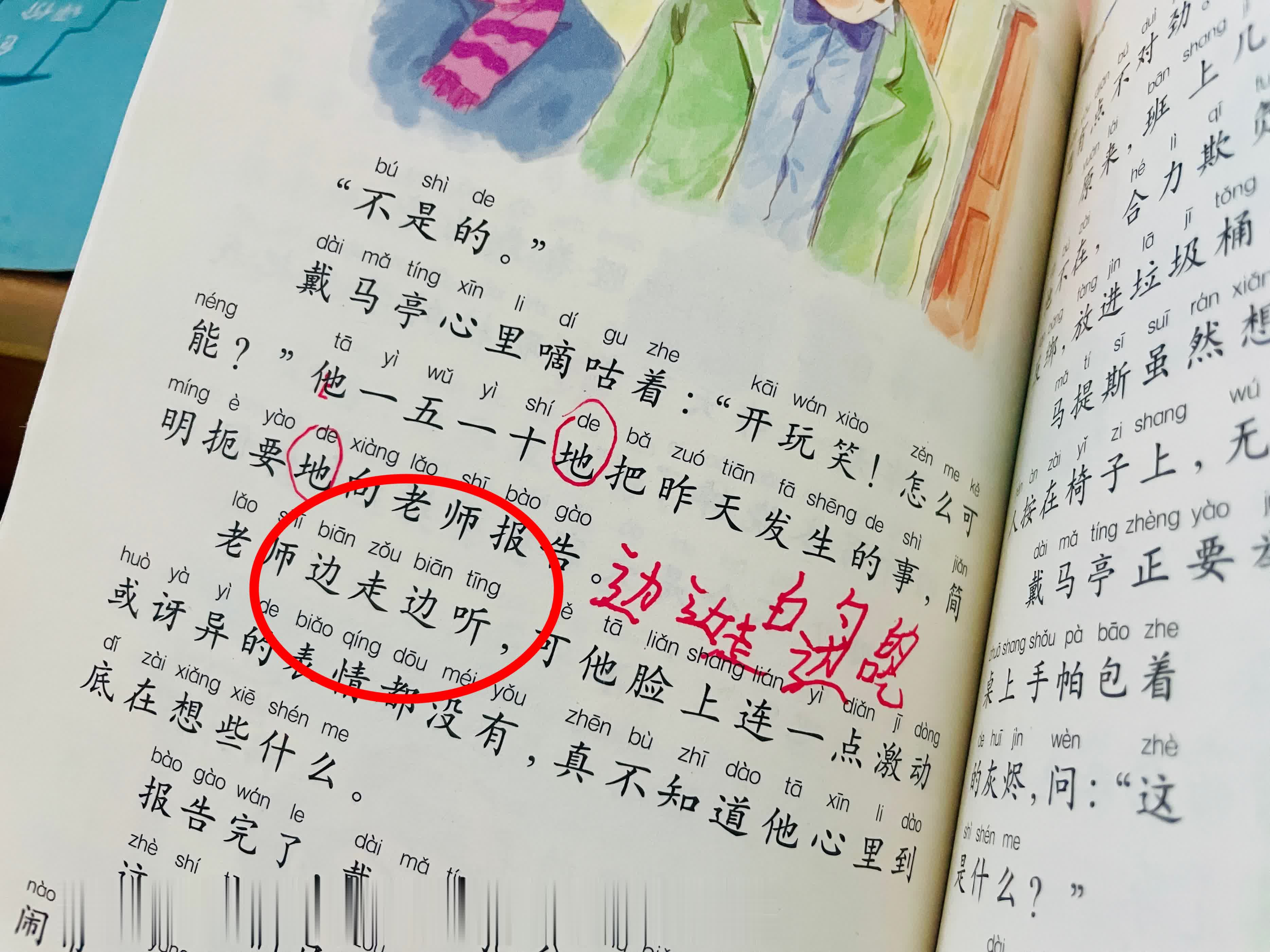 在第102页看到“老师边走边听”,想到边走边吃、边走边说、边走边唱,又意识到“边走边吃”是不太好的行为。
