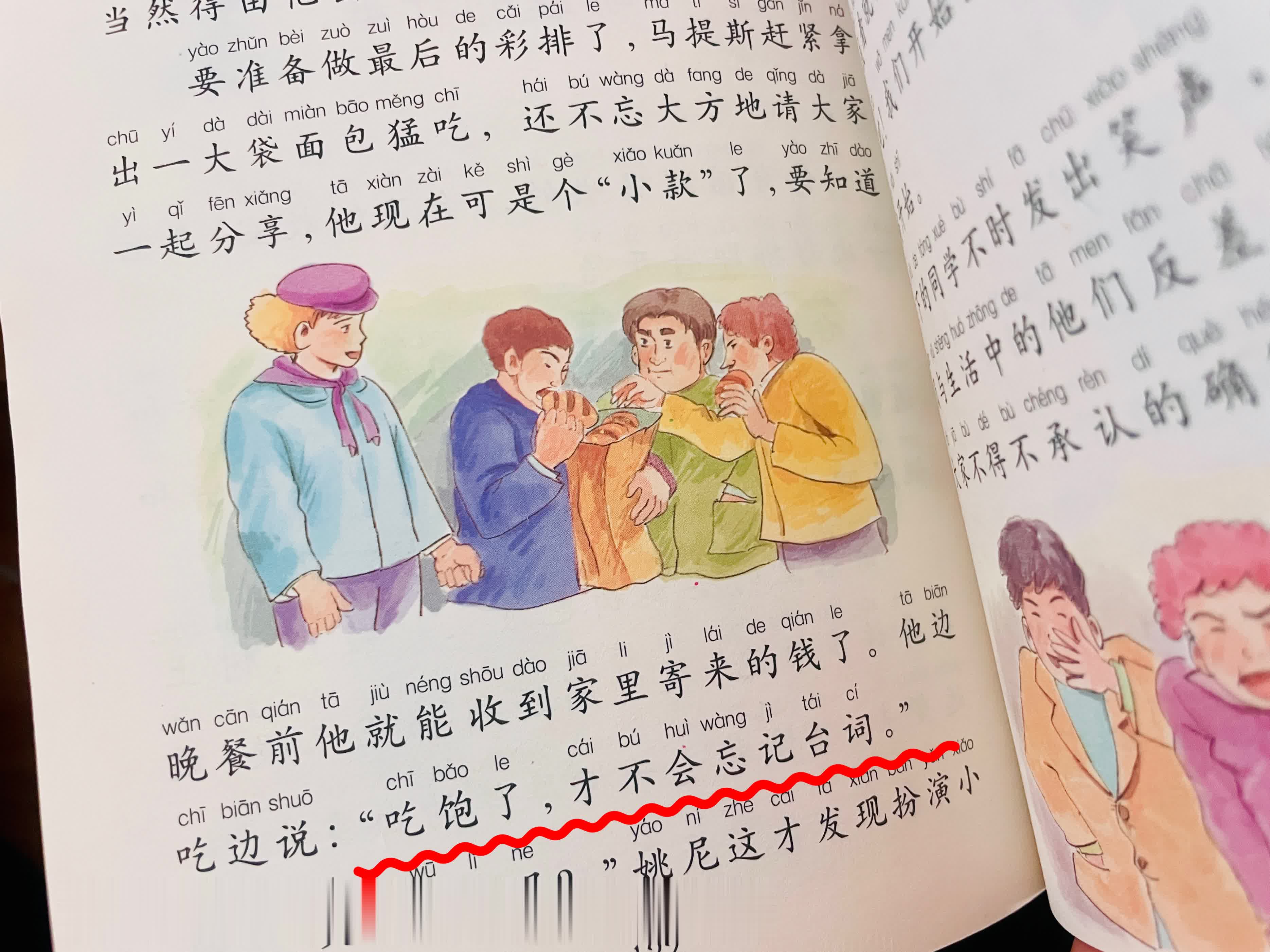 比如122页,让孩子找出马提斯说的话,孩子现在能快速找到这一句“吃饱了,才不会忘记台词”。