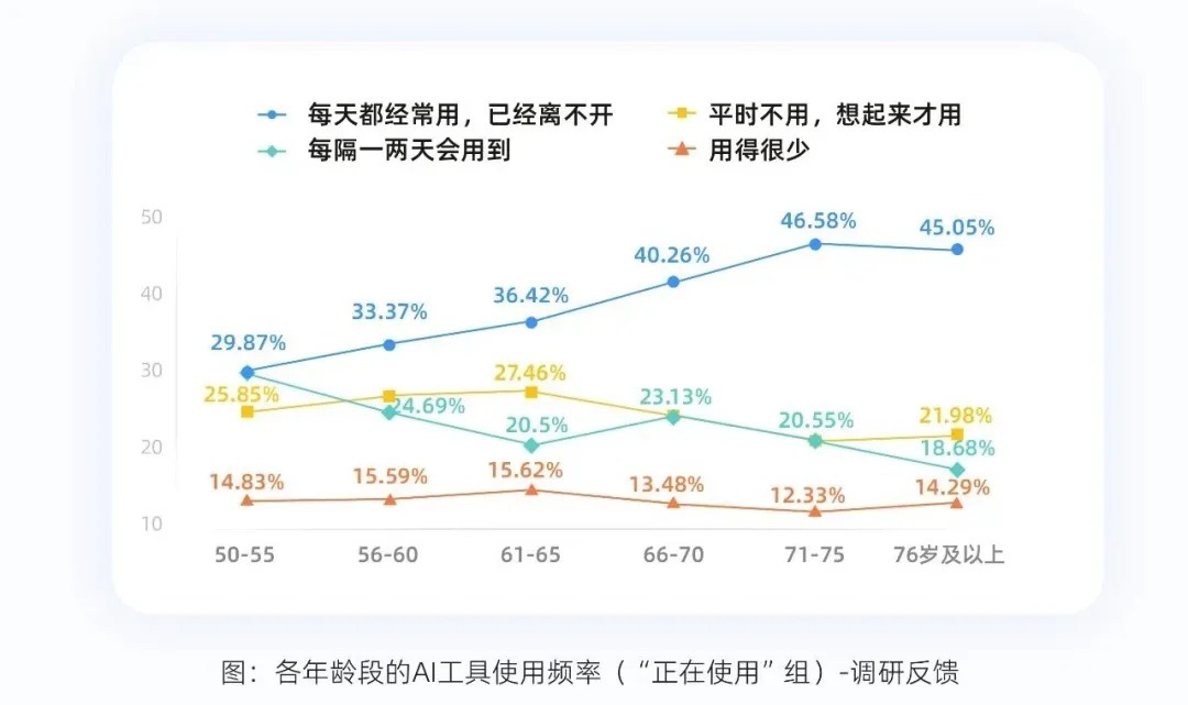 值得注意的是,这6个年龄段“每天都经常用AI”的高频用户占比分别为29.94%、33.37%、36.42%、40.26%、46.58%、45.05%,基本遵循年龄段越大、高活用户占比越高的特点。也就是说,虽然高龄老人使用AI的比例更低,但他们一旦开始使用,反而黏性更大、频次更高。