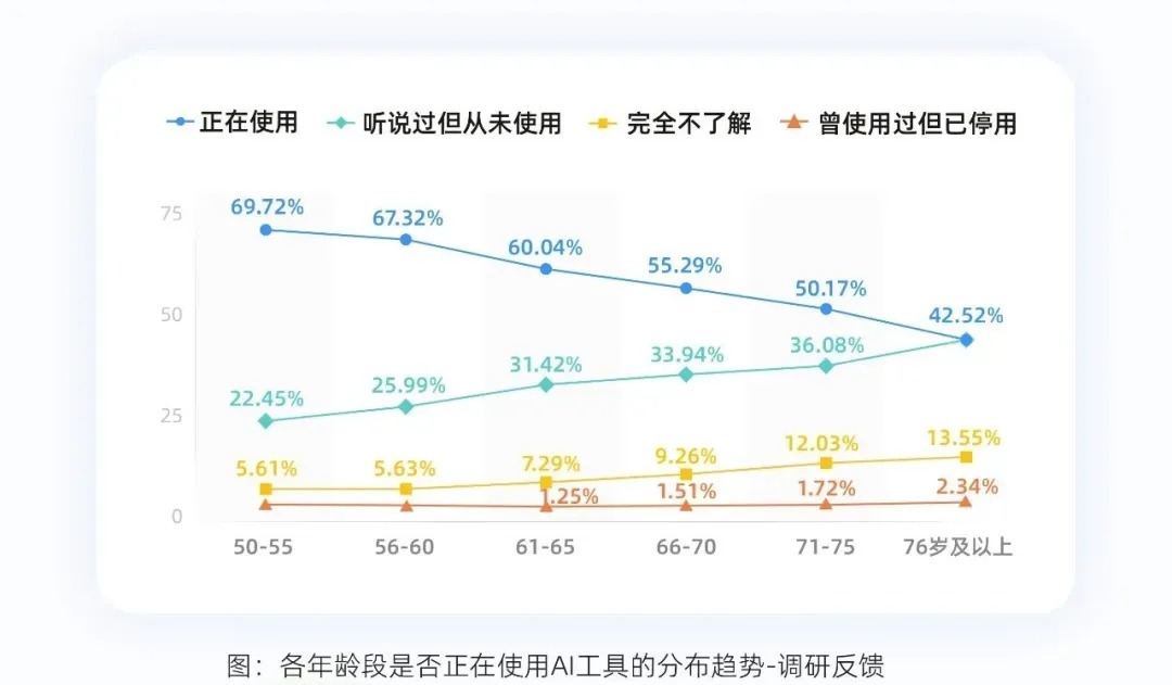 城乡差异分析表明,农村地区老年人AI认知普及率低于城市,但一旦开始使用,其活跃度和黏性反而更高。报告指出,超过70%的老年用户建议集中在"希望产品更易用"和"提供更多培训"方面。
